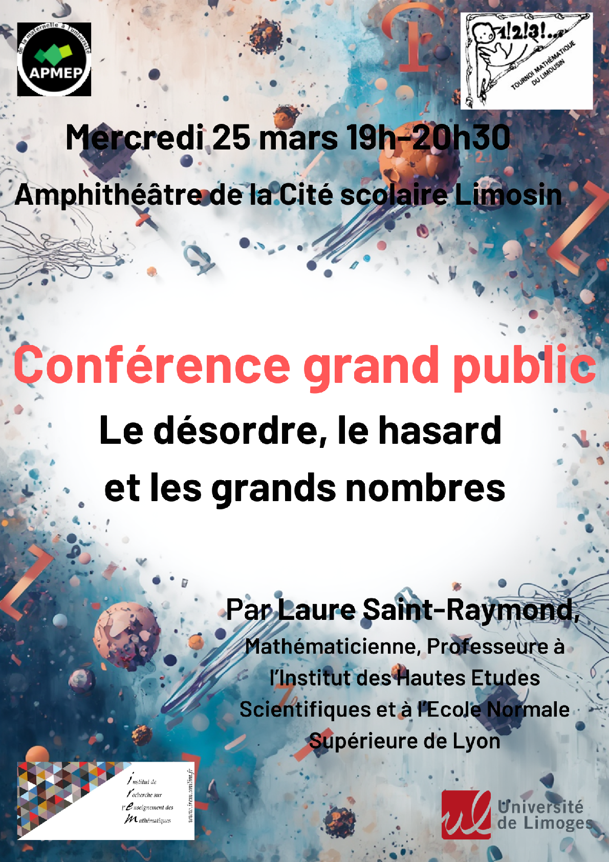 La journée académique, organisé par l’IREM, a eu lieu le vendredi 21 Février 2025 sur le site de la Faculté des Sciences et Techniques de Limoges. Le programme de cette journée est disponible ici et voici les liens vers les diverses présentations: